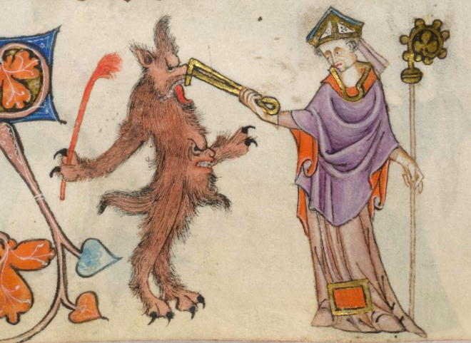| Tweaking the devil* [UPDATE: St. Dunstan grabs the Devil by the nose] London, British Library, Additional MS 42130, fol. 54v The Luttrell Psalter |